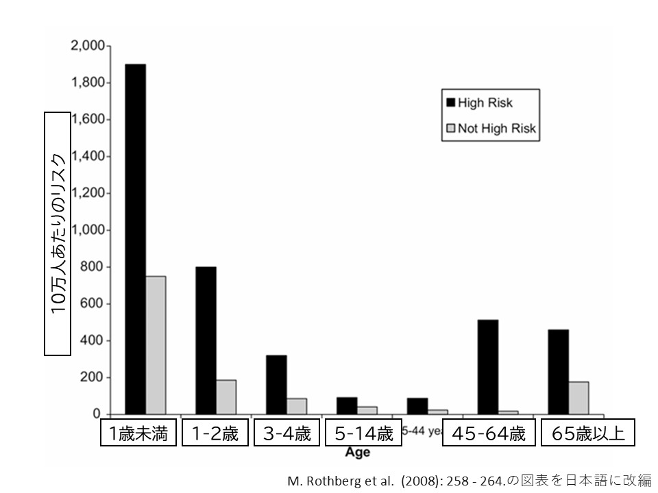 特に1歳未満の子にリスクが高いですが、特に3-4歳までは成人の方よりもリスクが高いことが分かります。